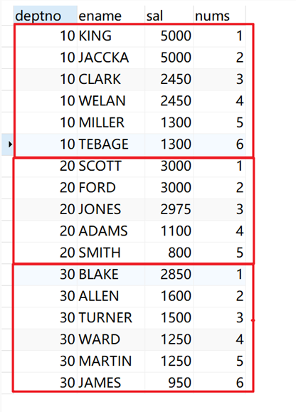 SELECT deptno, ename, sal, row_number() over ( PARTITION BY deptno ORDER BY sal DESC ) AS nums FROM emp;