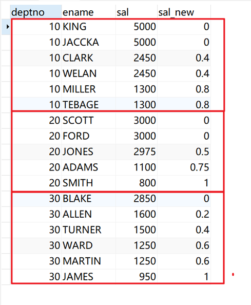 SELECT deptno, ename, sal, percent_rank() over ( PARTITION BY deptno ORDER BY sal DESC ) AS sal_new FROM emp;