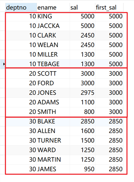 SELECT deptno, ename, sal, first_value( sal ) over ( PARTITION BY deptno ) AS first_sal FROM emp;