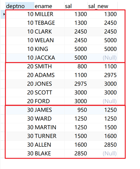 SELECT deptno, ename, sal, lead( sal, 1 ) over ( PARTITION BY deptno ORDER BY sal ) AS sal_new FROM emp;
