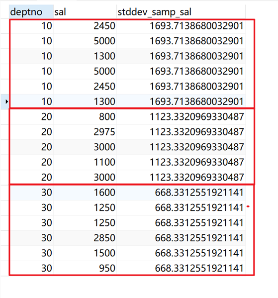 SELECT deptno, sal, stddev_samp(sal) over ( PARTITION BY deptno ) stddev_samp_sal FROM emp;