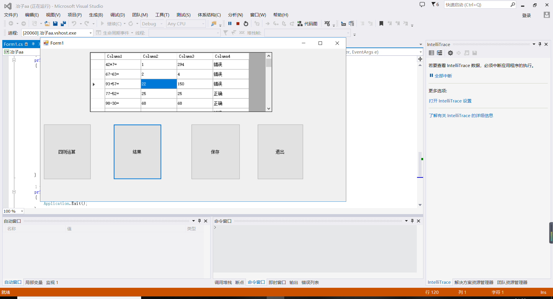 思路:一个datagridview控件用来存放题目和判断正误,使用4个BUTTON控件来选择生成题目,判断正误,保存错题,退出。