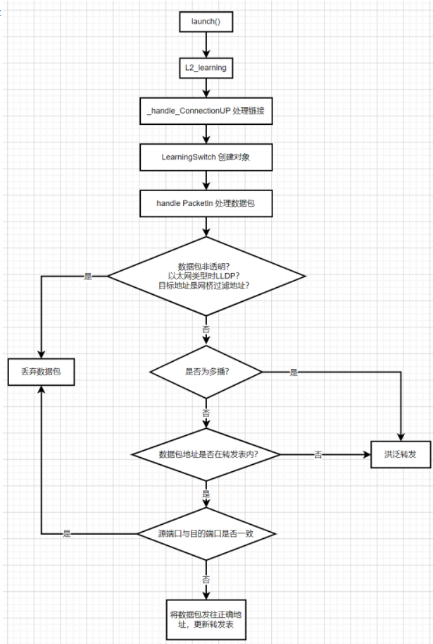 3.阅读L2_learning模块代码,画出程序流程图,使用 tcpdump 验证Switch模块。