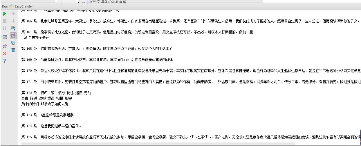 #需要调用的requests 库和 BeautifulSoup库中的bs4工具 import requests from bs4 import BeautifulSoup num=0#定义条数的初始值 #通过循环实现对不同页码的网页的数据爬取 for page in range(10): value = page * 20 #定义一个变量url url = 'https://movie.douban.com/subject/26683723/comments?start=%s&limit=20&sort=new_score&status=P&percent_type=' %str(value)#str转型 #获取这个网页的源代码 req = requests.get(url,{'User-Agent': 'Mozilla/5.0 (Windows NT 6.1; WOW64; rv:23.0) Gecko/20100101 Firefox/23.0'}) #生成一个Beautifulsoup对象 soup = BeautifulSoup(req.text,'lxml') xml = soup.find_all('p',class_='') for i in range(len(xml)): msg = xml[i].string if not msg is None: num += 1 print('第', num, '条', msg)