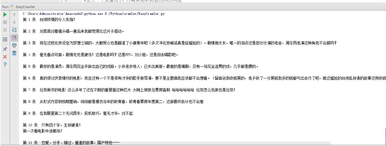 #需要调用的requests 库和 BeautifulSoup库中的bs4工具 import requests from bs4 import BeautifulSoup num=0#定义条数的初始值 #定义一个变量url,为需要爬取数据我网页网址 url = 'https://movie.douban.com/subject/26683723/comments?status=P' #获取这个网页的源代码,存放在req中 req = requests.get(url,{'User-Agent': 'Mozilla/5.0 (Windows NT 6.1; WOW64; rv:23.0) Gecko/20100101 Firefox/23.0'}) #生成一个Beautifulsoup对象 soup = BeautifulSoup(req.text,'lxml') xml = soup.find_all('p',class_='') for i in range(len(xml)): msg = xml[i].string if not msg is None: num += 1 print('第', num, '条', msg)