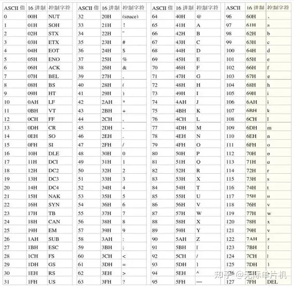 如上表:每一个ASCII 都有3部分组成. ASCII值、16进制、控制字符。