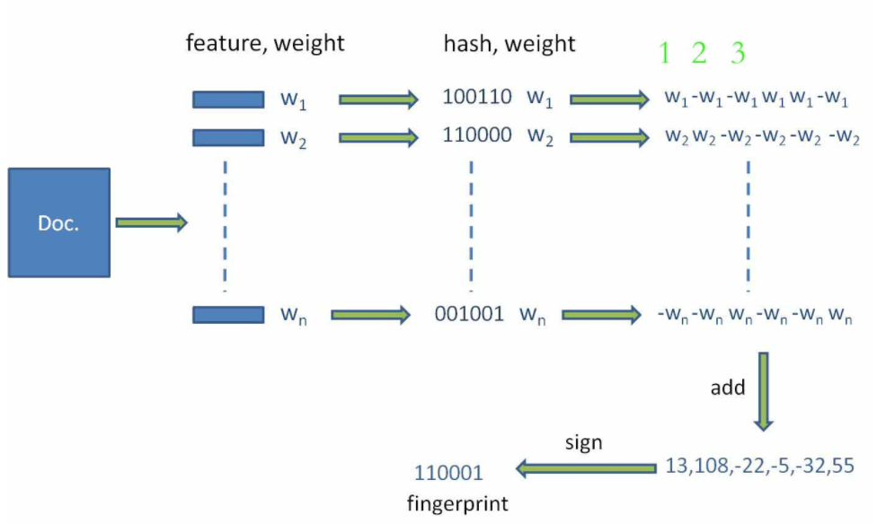 hash:通过hash函数计算各个特征向量(这里为划分好的词)的hash值,hash值为二进制数01组成的n-bit签名。