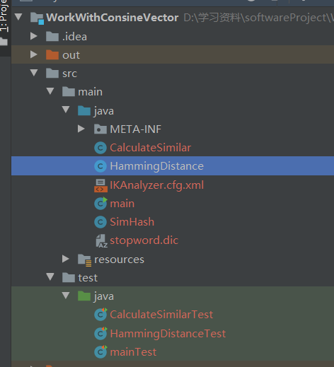 其中main是程序的入口,也即启动类;CalculateSimilar类是实现余弦相似度的类;