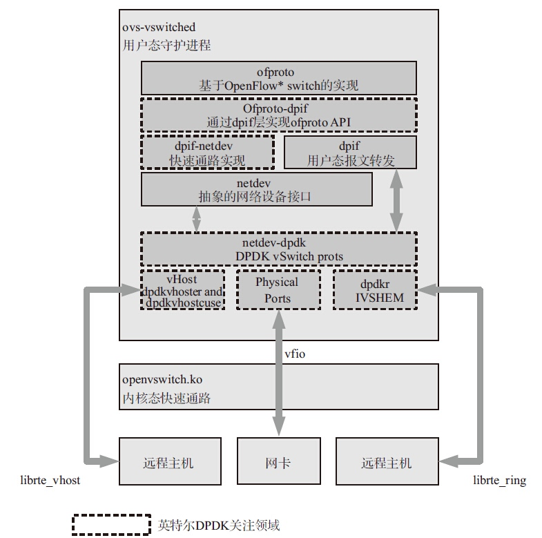 DPDK加速的OVS与原始OVS的区别在于,从OVS连接的某个网络端口接收到的报文不需要openvswitch.ko内核态的处理,报文通过DPDK PMD驱动直接到达用户态ovs-vswitchd里。