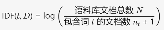 加1平滑:防止 nt=0 时分母为零。若“苹果”在1000篇文档中出现20次,则IDF = log(1000/21)≈1.67。