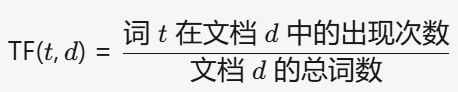 - 词频(TF):词在单篇文档中出现的频率越高,对该文档的代表性越强。