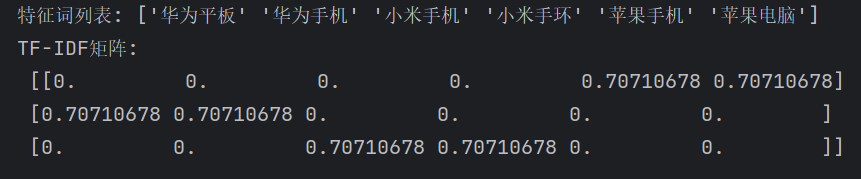 print("TF-IDF矩阵:\n", tfidf_matrix.toarray())
