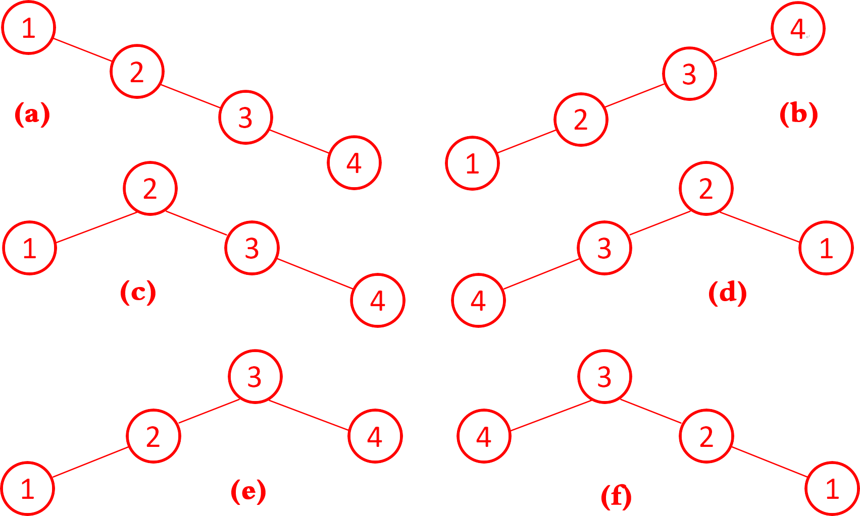 (2)子树的遍历顺序:对于每个非叶子节点,其子树的遍历顺序是任意的,若节点有个子树,则贡献! 种DFS序列。如样例1:给定一棵有个结点的树已退化为为链表,如下图(a)所示。如选①、④为起点,DFS遍历序各只有一种(下图(a)、(b)) ;选②为起点,DFS遍历序有两种(下图(c)、(d));选③为起点,DFS遍历序也有两种(下图(e)、(f))。合计共6种。