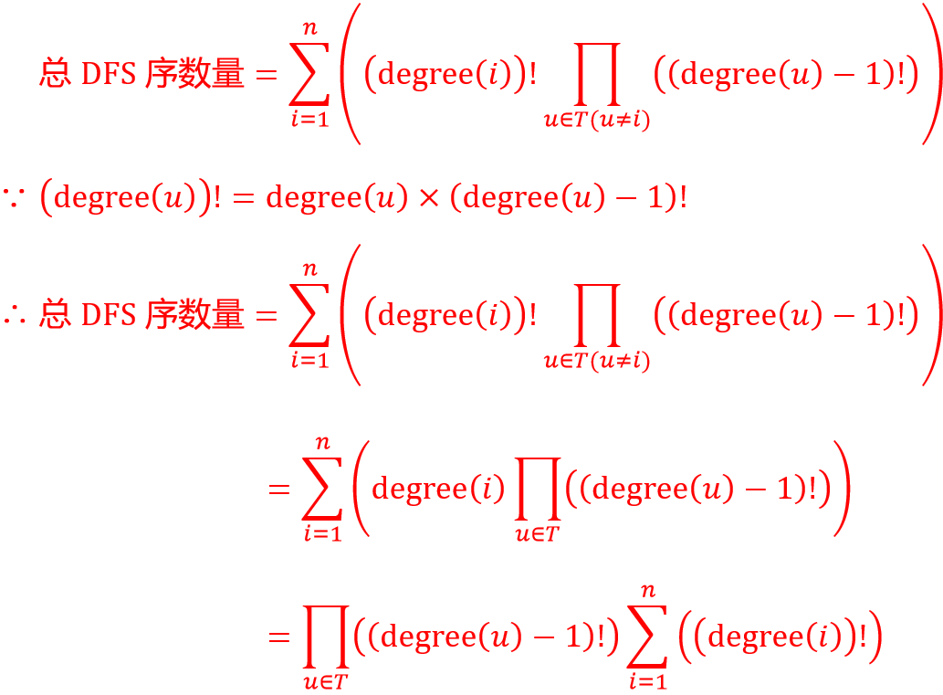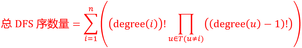 树的DFS遍历序数量取决于两个因素:(1)起点选择:共有n种可能的起点(∈[1,])。(2)子树的遍历顺序:对于每个非叶子节点,其子树的遍历顺序是任意的,若节点有个子树,则贡献!种排列方式。