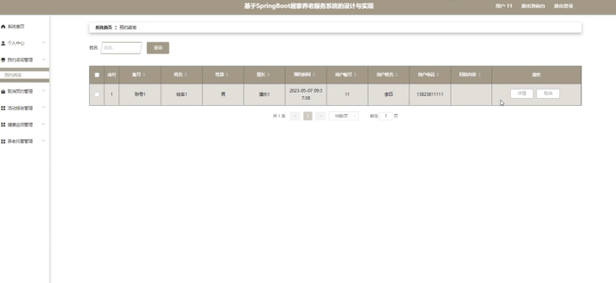 用户点击预约咨询管理。在预约咨询页面输入姓名进行查询预约咨询列表,并根据必须对预约咨询详情信息进行详情或取消操作;如图5-17所示: