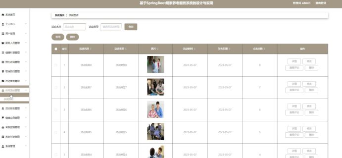 管理员进入主页面,首要功能包括对个人中心、用户管理、服务人员管理、健康科普管理、预约咨询管理、取消预约管理、活动类型管理、休闲活动管理、活动报名管理、健康监测管理、紧急救援管理、养老托管管理、系统管理等进行处理。管理员主界面如图5-7所示: