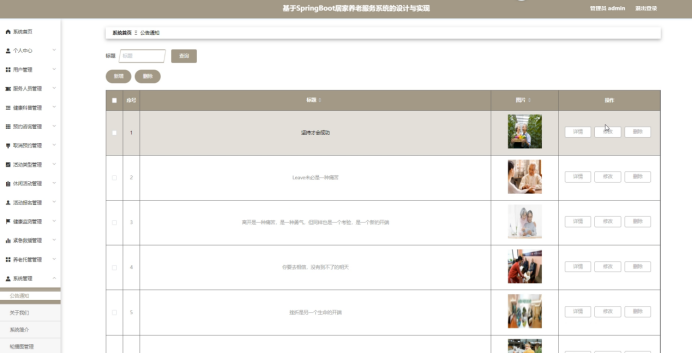 通过管理员点击系统管理。在公告通知页面输入标题进行查询、新增或删除公告通知列表,并根据需要对公告通知详情信息进行详情、修改或删除操作;还能够对关于我们、环境简介和轮播图管理进行详情操作;如图5-13所示: