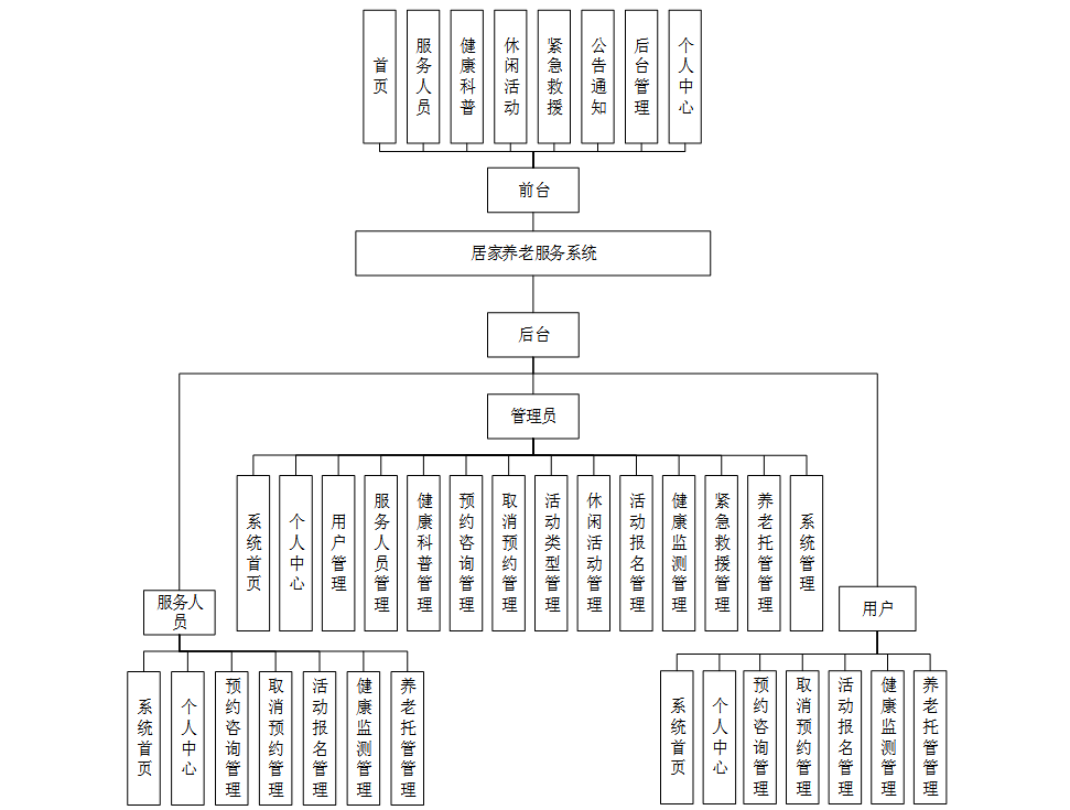 系统整体模块设计:系统分为管理员、服务人员和用户三大角色,系统管理员有最大的权限,整体效果展示如图4-3所示。