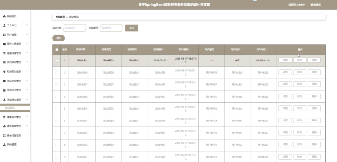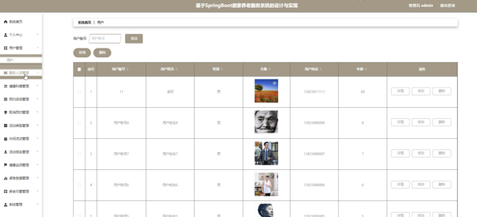 管理员管理:管理员拥有最高权限,可以管理用户和服务人员信息,发布健康科普内容,管理预约咨询和取消预约,处理活动报名,发布系统公告,管理紧急救援信息,以及进行养老托管和健康监测管理。
