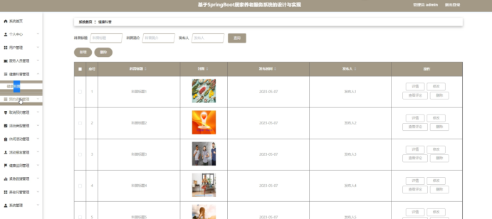 管理员点击健康科普管理。在健康科普页面输入科普标题、科普简介和发布人进行查询、新增或删除健康科普列表,并根据需要对健康科普详情信息进行详情、修改、查看评论或删除操作;如图5-10所示: