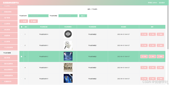 图5.3 即为编码完成的平台资讯管理界面,管理员在平台资讯管理界面中新增平台资讯,可能删除平台资讯。