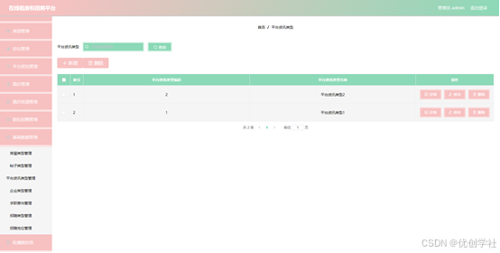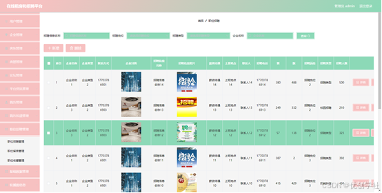 图5.2 即为编码实现的招聘管理界面,管理员在招聘管理界面中查看招聘种类信息,招聘描述信息,新增招聘信息等。