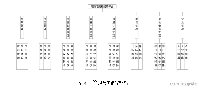 第4章:设计在线租房和招聘平台管理系统的功能结构,设计数据库E-R图以及对数据表的存储结构进行设计。