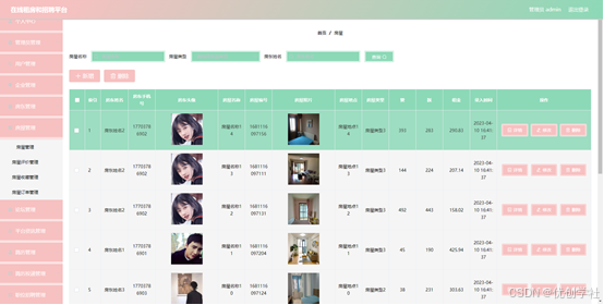 通过图5.1 即为编码实现的房屋管理界面,管理员在房屋管理界面中可以对界面中显示,能够对房屋信息的房屋状态进行查看,许可添加新的房屋信息等。