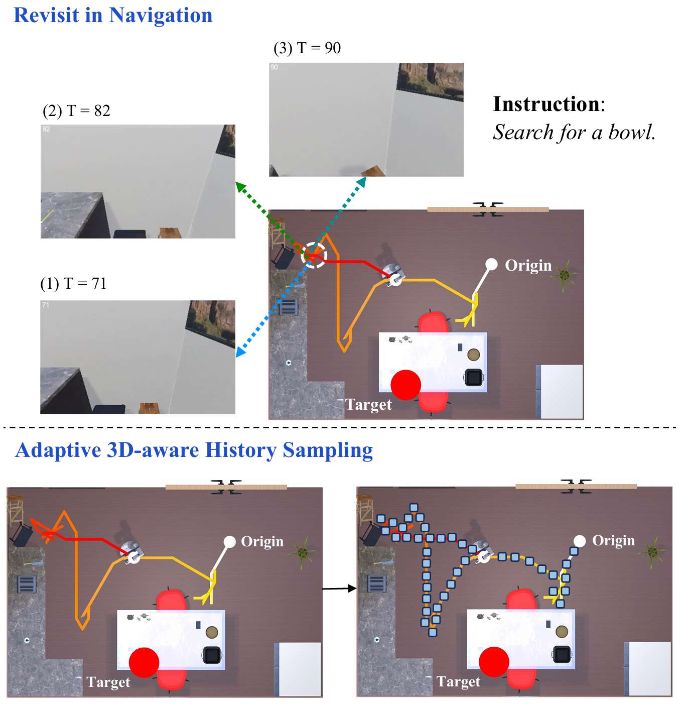 - 引入了自适应的3D感知历史采样策略,通过控制历史采样在空间和语义域中的密度和多样性,有效地减少了观测冗余,提高了导航效率。