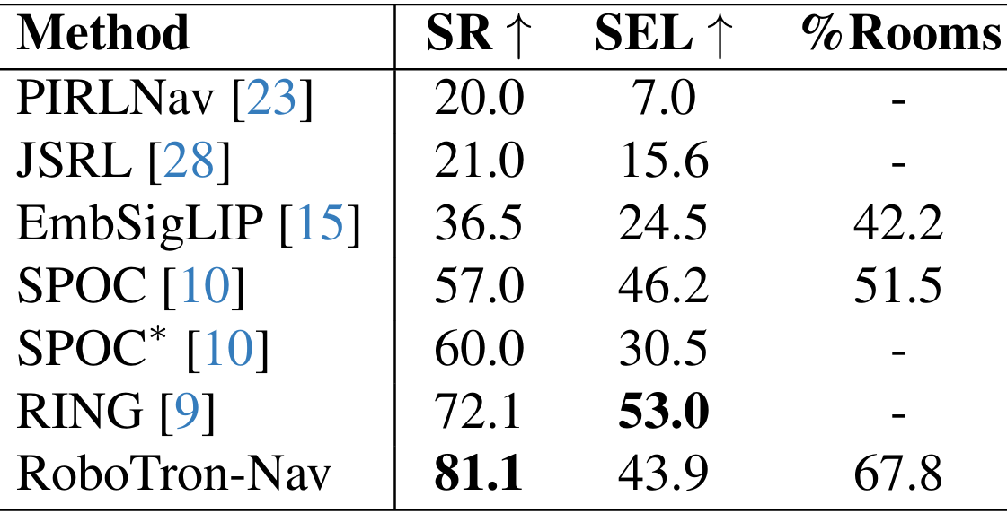 - 与其他办法的比较:与PIRLNav、JSRL、EmbSigLIP、SPOC、SPOC*和RING等方法相比,RoboTron-Nav在SR、SEL和%Rooms三个指标上均取得了最佳性能,证明了其在长期导航中的优越性。