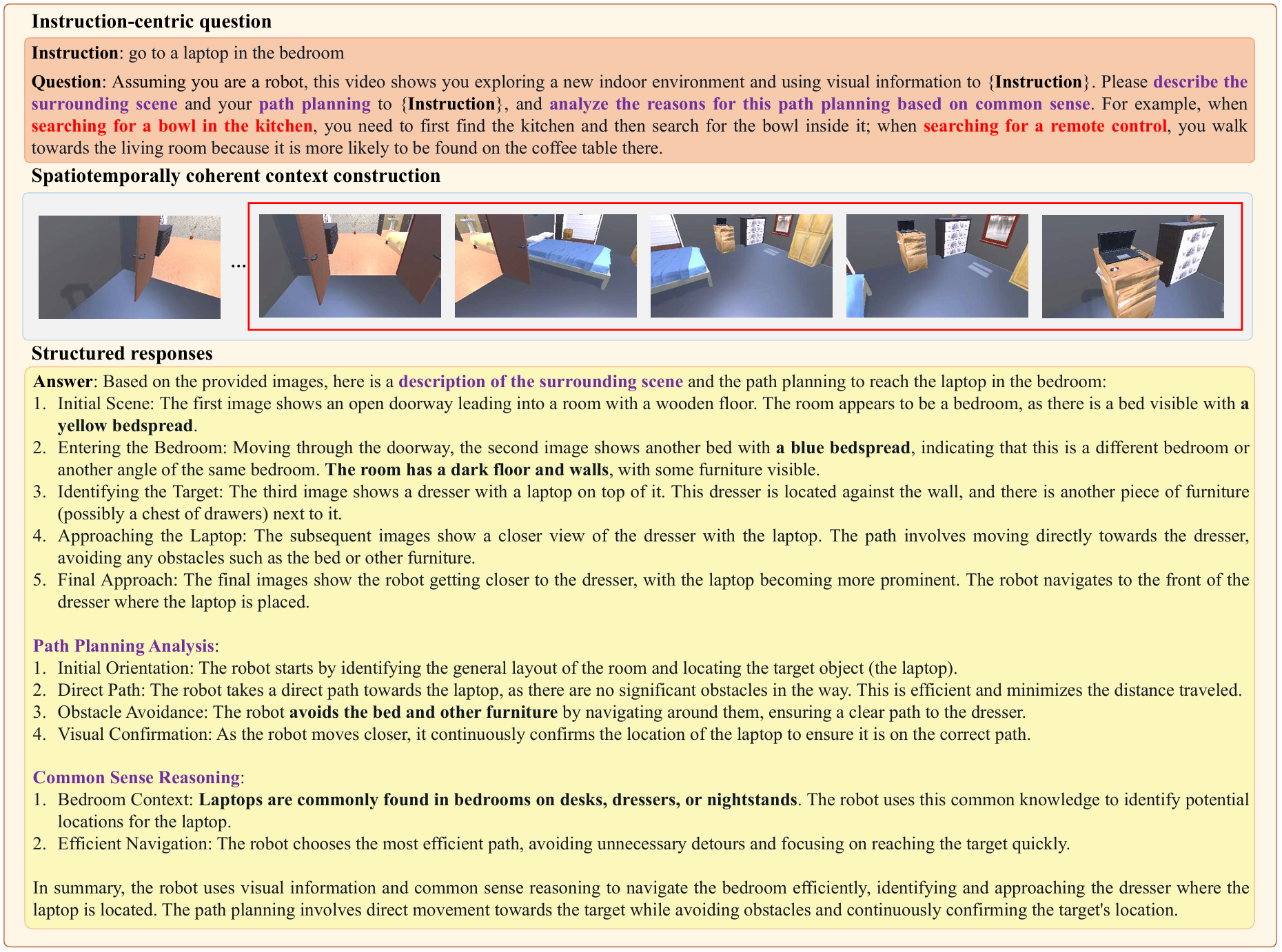 - 结构化响应:通过将文本挑战与精选的视觉序列相结合,合成与指令对齐的多模态提示。GPT-4o生成结构化响应,涵盖场景描述、路径规划分析和常识推理。