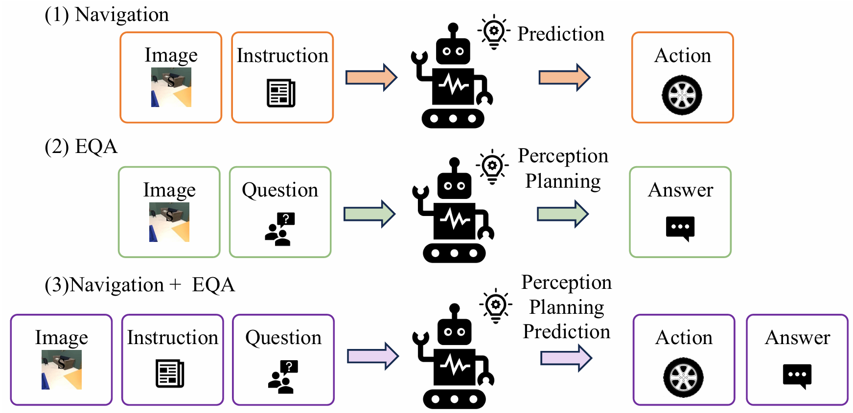 为了解决单任务学习的局限性,引入了多任务协作策略,通过在导航任务和EQA任务上进行联合训练,显著提升导航能力。在训练阶段,模型同时从两个任务中学习,输入包括导航指令和EQA疑问。在推理阶段,模型专注于预测导航动作,利用在训练过程中获得的感知和规划能力。