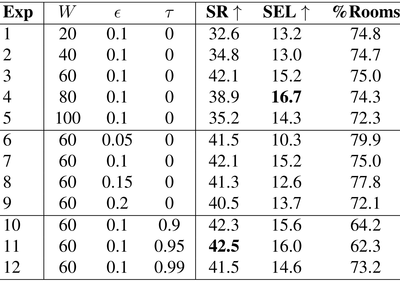 - 超参数分析:通过实验分析了3D感知历史采样策略中不同超参数(窗口大小WWW、相对位置阈值ϵ\epsilonϵ和语义相似性阈值τ\tauτ)对性能的影响,得出了最优的超参数设置:W=60W=60W=60、ϵ=0.1\epsilon=0.1ϵ=0.1和τ=0.95\tau=0.95τ=0.95。