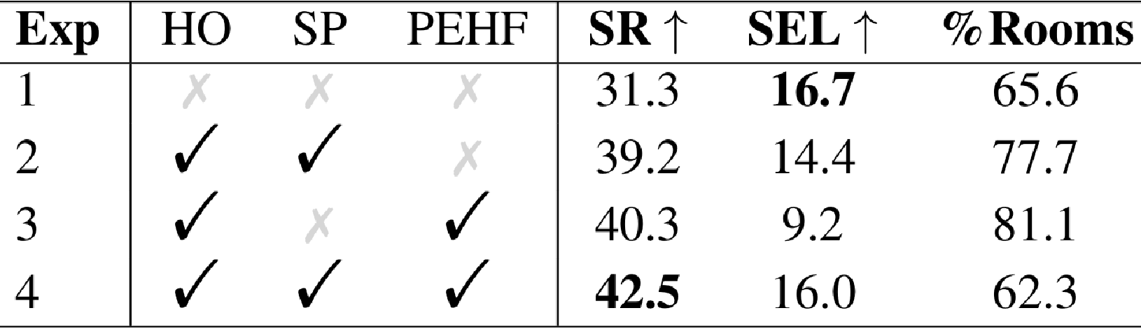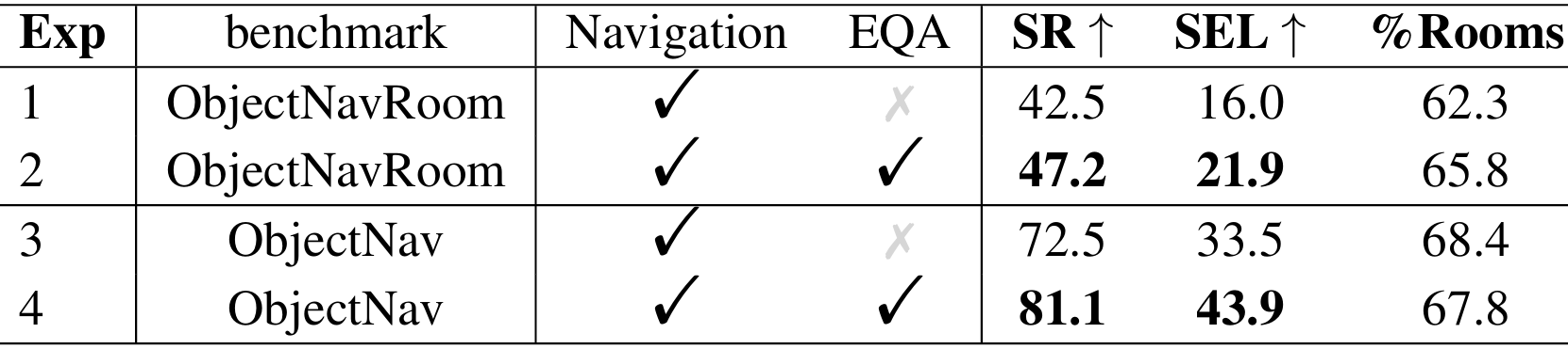 - 数据集和评估指标:在CHORES-S ObjectNav基准测试上评估所提出的途径,并扩展导航数据集以包含EQA对用于联合训练。使用成功率(SR)、按剧集长度加权的成功率(SEL)和访问房间的百分比(%Rooms)三个指标来全面评估途径的有效性。