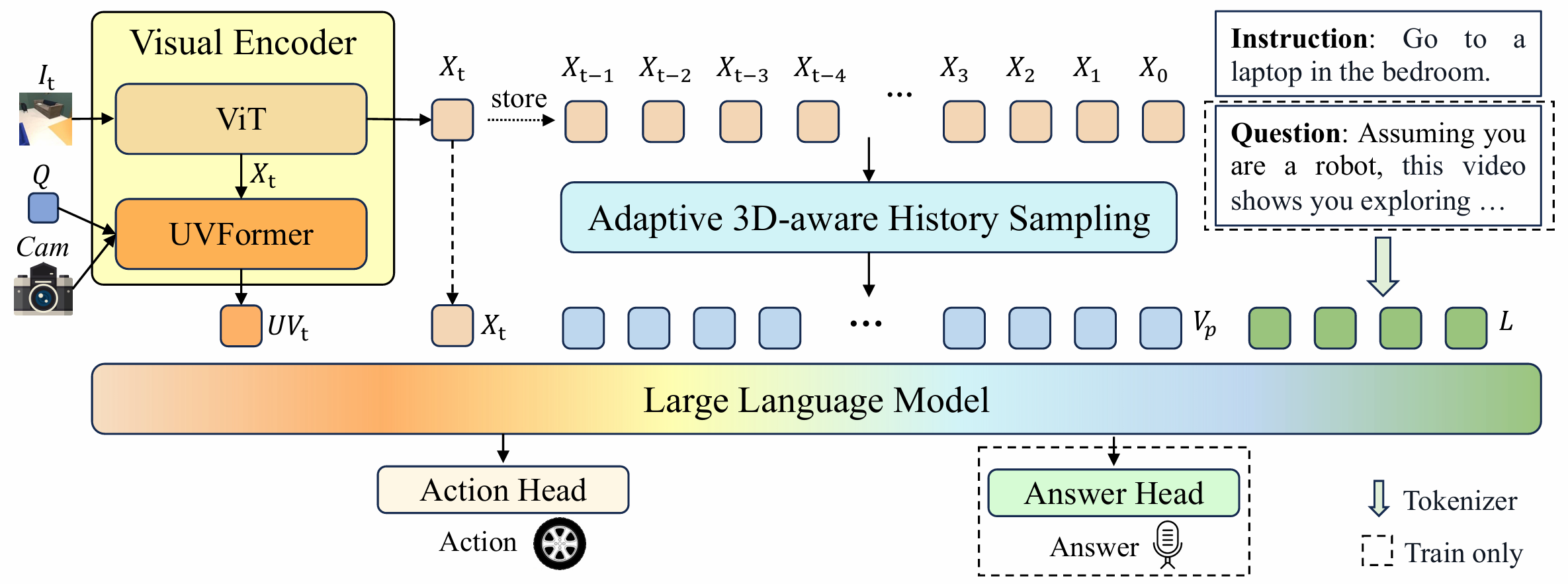 将位置增强的历史特征VpV_pVp与视觉编码器的当前观测UVtUV_tUVt和XtX_tXt整合,形成视觉标记,输入到LLM中。同时,将输入指令或问题通过分词器转换为语言标记LLL,这些视觉和语言标记组合后输入到LLM中。LLM利用其多模态对齐和理解能力处理这些标记,并通过专门的头部进行解码,生成可执行动作或自然语言答案。