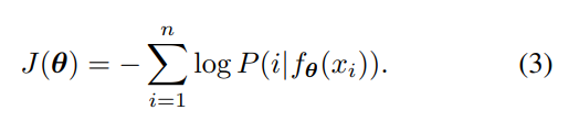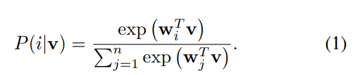 v1, . . . , vn , vi = fθ(xi)。一张图片x,经过网络之后,得到特征v=就是n个图片, x1, . . . , xn ,有n个类别,它们的特征(),被识别为第i个类别的概率是: