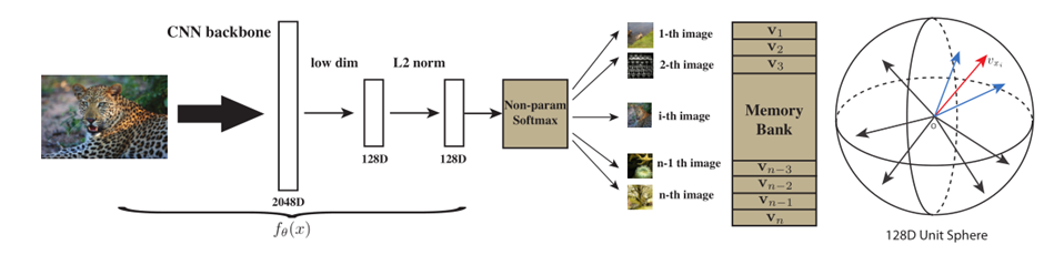 既然是对比学习,就需要正负样本。InstDisc中正样本就是就是这个图片本身(可能经过一些数据增强),数据集里所有其它的图片就是负样本就,这些负样本都存储在memory bank里。对于ImageNet有128万张图片,那么memory bank就要存储128万行,于是最后每张图都用128维特征表示(维度太高存储不了)。