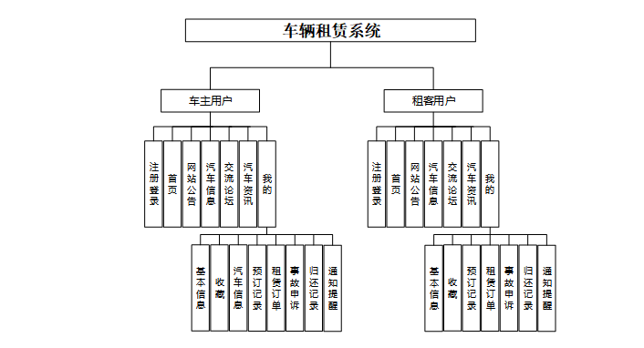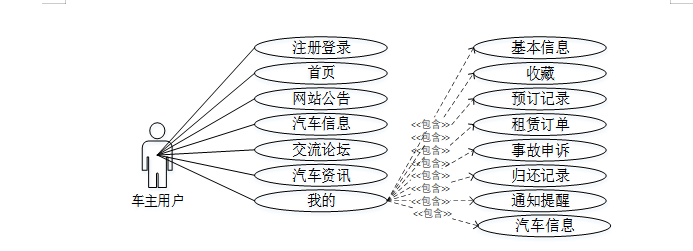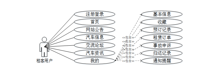 通过对应的功能做了需求分析以后该车辆租赁环境的各角色主要包括的功能说明如下: