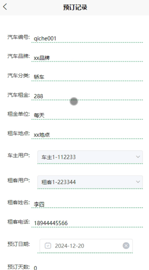 我的:这是用户的个人中心,用户可以查看和编辑自己的基本信息,具备姓名、联系方式、身份证号、驾照信息等,用于身份验证和信息核对。收藏特性:用户可将感兴趣汽车信息加入收藏夹,便于日后查看和比较。添加租赁汽车信息:用户可填写汽车详细信息,如品牌、型号、价格、租赁条件,并添加至租赁列表。预订记录:用户可查看所有预订汽车的记录,包括预订时间、租赁时间、汽车型号等。租赁订单:用户可查看所有已完成租赁订单,包括租赁时间、归还时间、租赁费用等。事故申诉:用户遇事故可提交申诉,平台将及时处理并提供解决方案。归还记录:用户可查看所有已归还汽车记录,包括归还时间、汽车状态等。通知提醒:平台发送订单状态更新、租赁时间提醒等通知,帮助用户管理租赁事务。