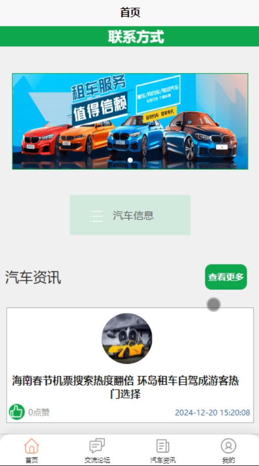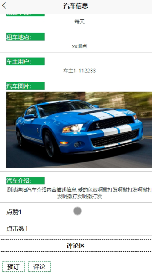 汽车信息:用户可以浏览不同车型的详细信息,包括车辆图片、规格参数、租金价格等。体系提供点赞、收藏和评论作用,方便用户表达对车辆的喜好,并进行预订。