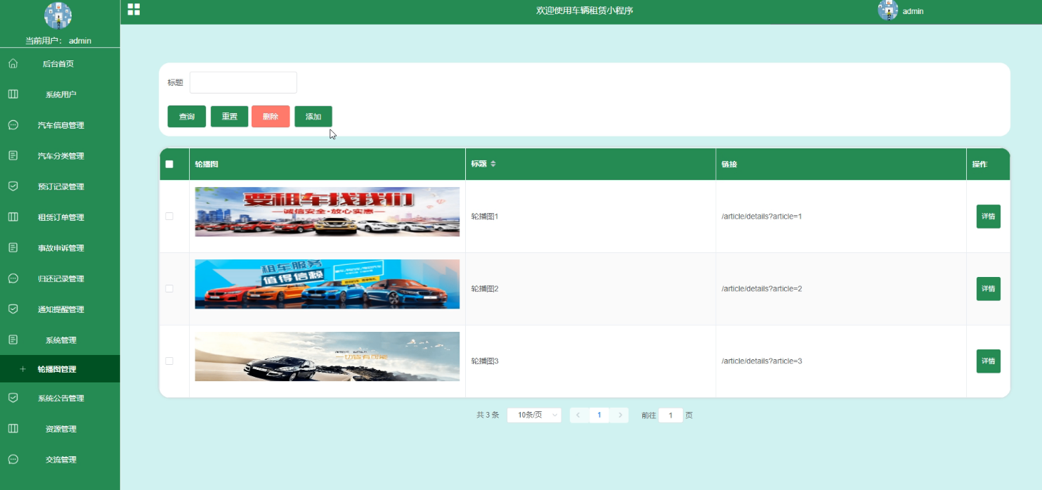 通过功能涵盖了轮播图的添加、删除和查询操作。具体来说,用户能够通过系统管理界面轻松地上传新的轮播图,以便在网站或应用的显眼位置展示重要信息或活动。系统管理界面布局如下图: