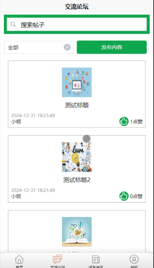 管理员负责交流论坛的管理,包括添加、删除和查询论坛分类,以及管理论坛帖子,维护良好的用户交流环境。交流管理界面布局如下图:
