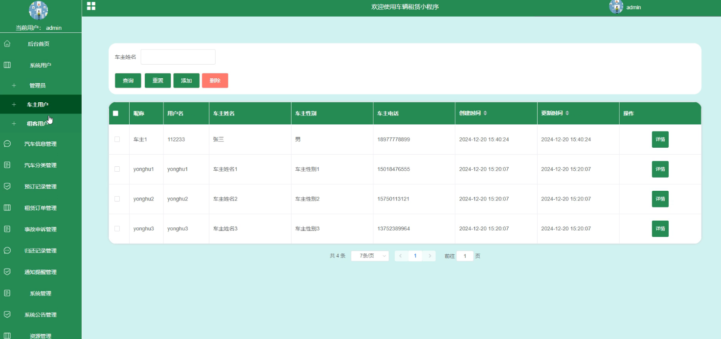根据应用该环境的用户角色可以划分为租客用户、车主用户和管理员,具体如下所示。
