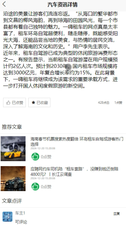 汽车资讯:给出最新的汽车相关新闻、保养知识、驾驶技巧等内容。用户可以对感兴趣的文章进行点赞、收藏和评论,以获取更多有用信息。