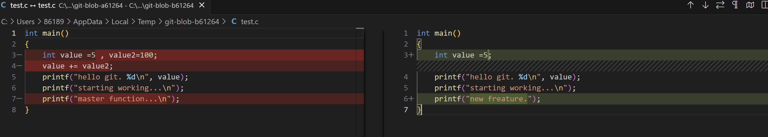 然后修改test.c增加value2,value += value2 及 printf("master function...\n");。 但是此时我只需要合并value2的这个功能到分支,不需要把printf也合并过去。显然不能用git merge(因为它是所并所有提交的改动)