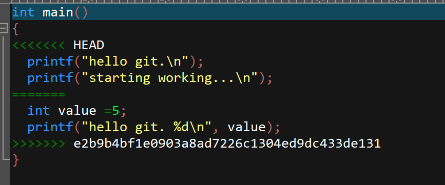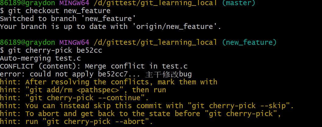 但是提示错误,因为发生了最后一行printf冲突, 选择终止cherry-pick。文件内容不一样,我们手动打开文件进行修改,选择不要,最后提交修改。.