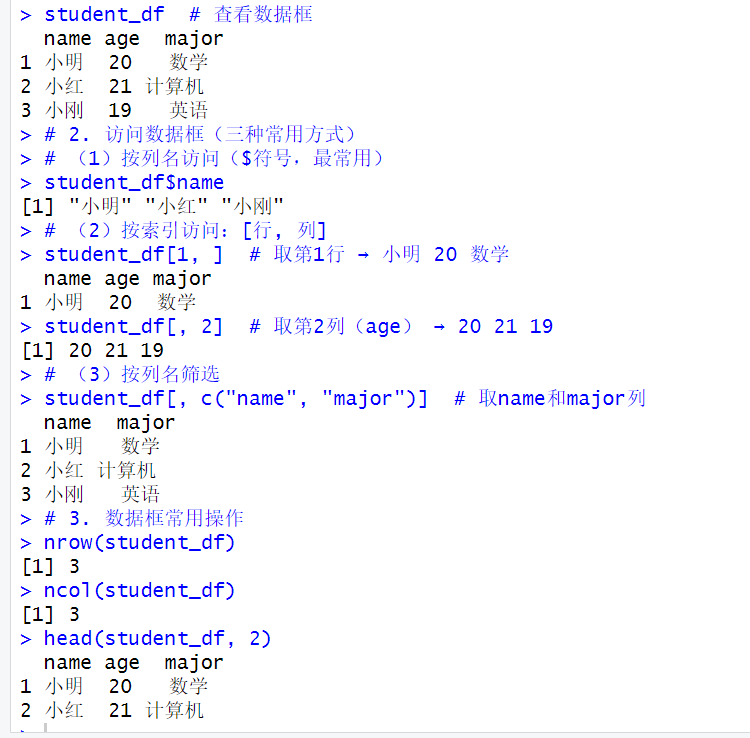 | 数据框(DataFrame) | 2 维 | 混合类型 | 表格形式,列可不同类型(最常用!) | data.frame() |