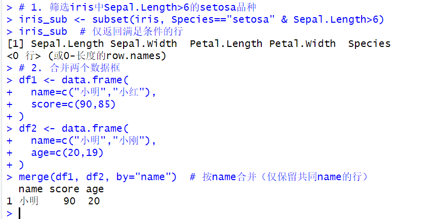 subset(x, condition) | 按条件筛选行 | subset(iris, Species=="setosa") 筛选 setosa 品种 |