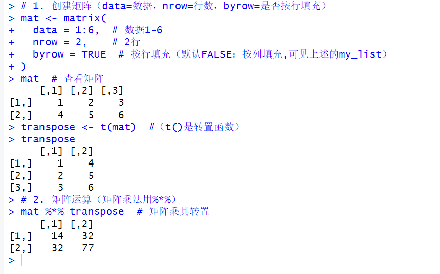 | 矩阵(Matrix) | 2 维 | 单一类型 | 行 + 列的表格,元素类型一致 | matrix() |