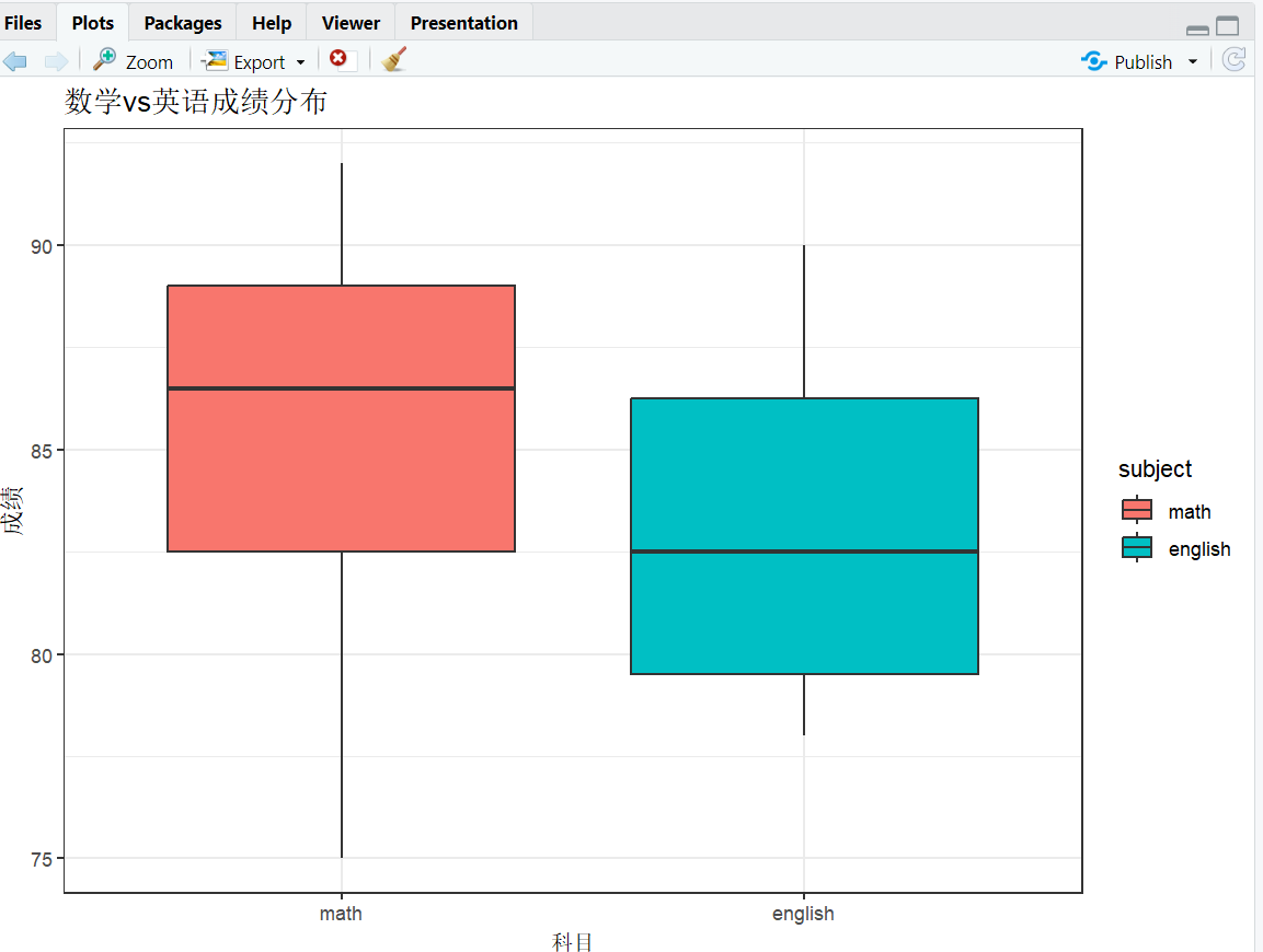 labs(title="数学vs英语成绩分布", x="科目", y="成绩") +